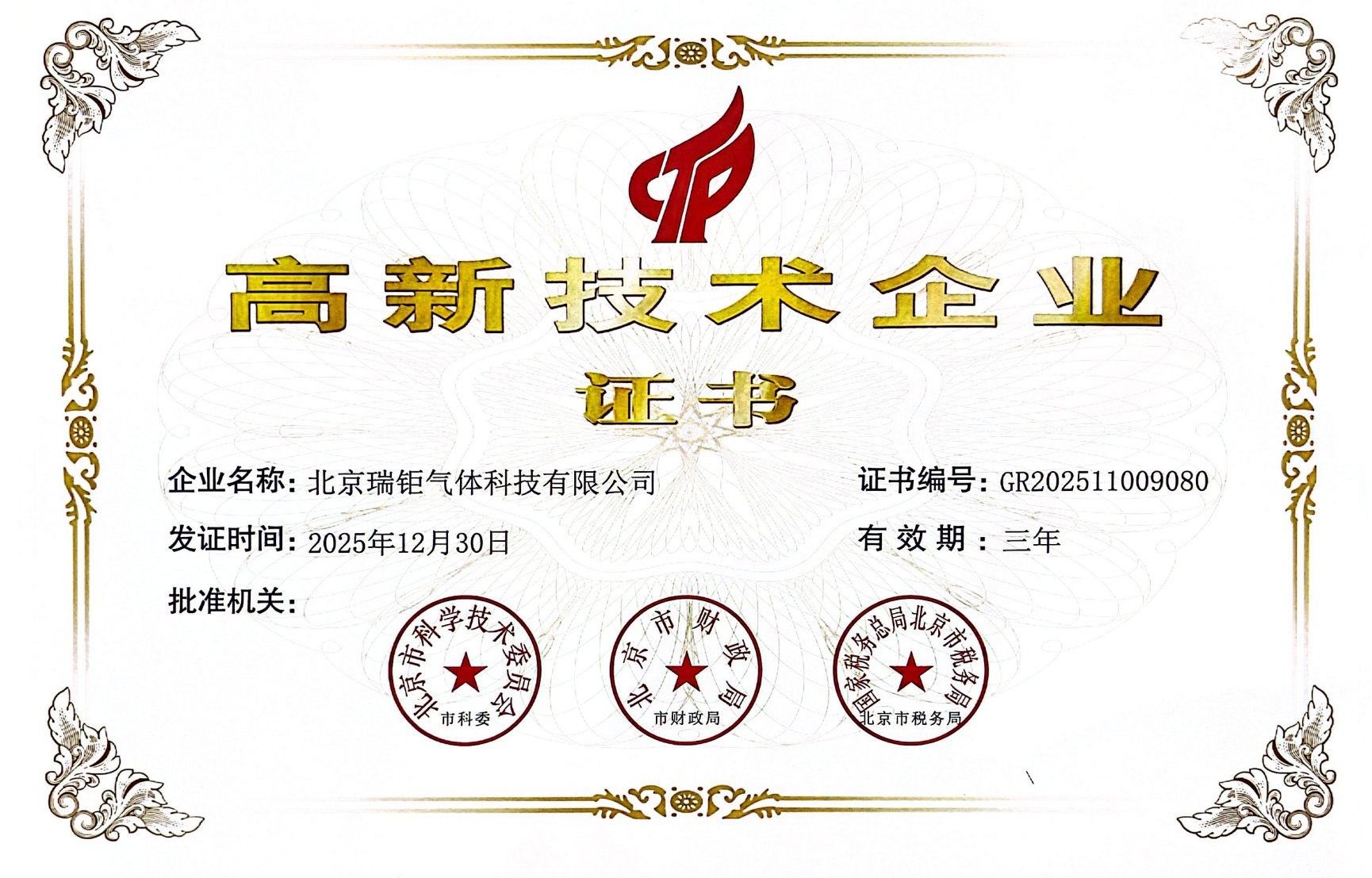 近日,北京瑞钜气体科技有限公司经国家科技部、财政部、国家税务总局联合认定,成功获评国家级高新技术企业,并正式取得高新技术企业证书。